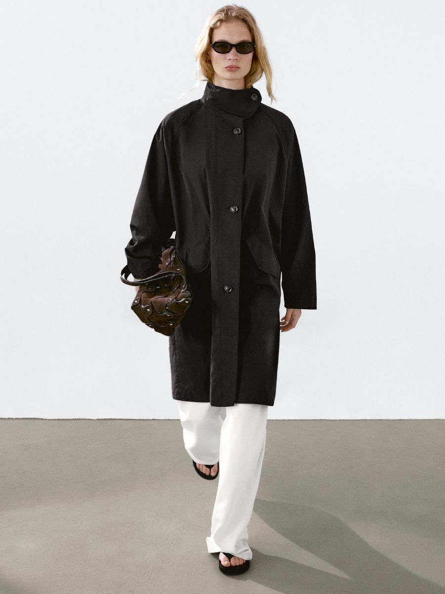 Black oversized water repellant trench coat, €129, at Massimo Dutti.