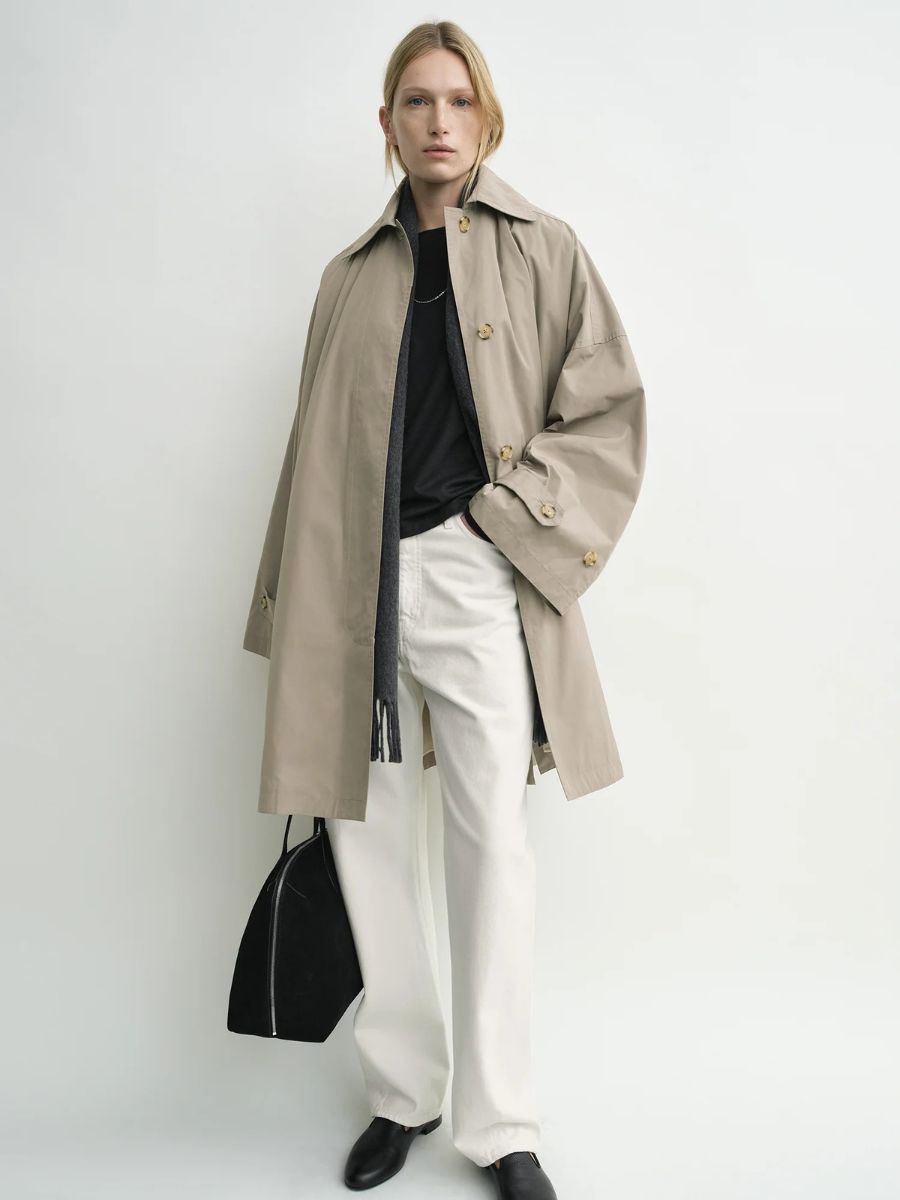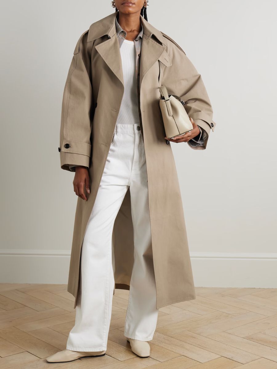 Beige oversized cotton double-breasted trench coat, Róhe, €1,350; www.net-a-porter.com.