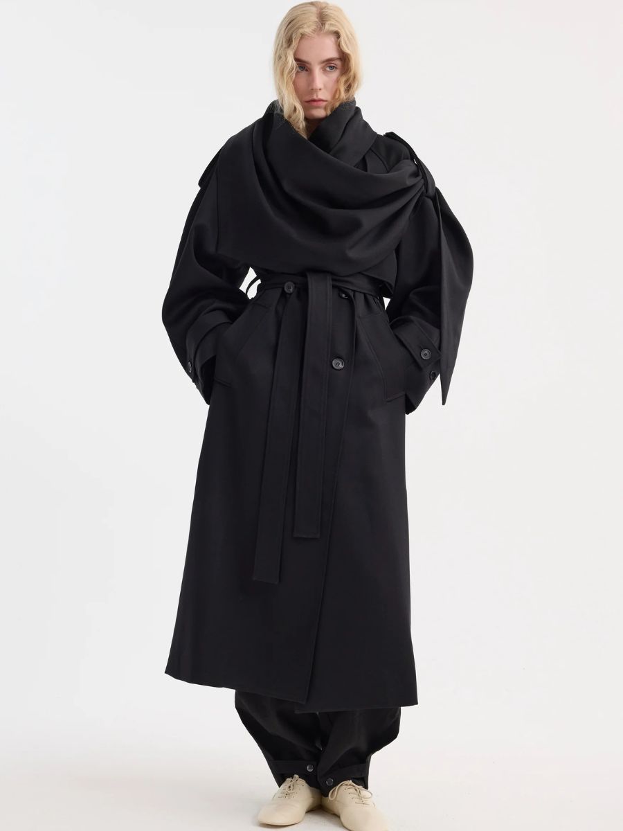 Black oversized trench with scarf detail, €1,395; www.roheframes.com.