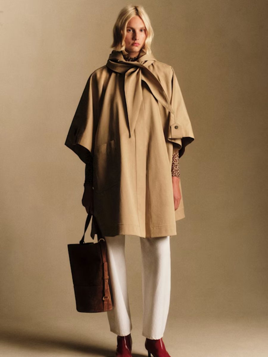 For autumn, trench options run the gamut from classic to contemporary, by way of playful shapes (and a pinch of To The Manor Born dressing). The current vogue for barn and worker jackets has seen hero utility touches creep into trench dressing, from corduroy collars and moody shades with water-repellent fabrics that speak to a trench and wax jacket hybrid. A retro take on the trend is the classic car coat, which sees stalwart beige coats assume a more polished look with a straighter fit.
