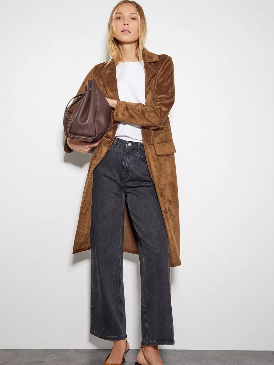 Beige suedette trench coat, Monsoon, €170; www.very.ie.