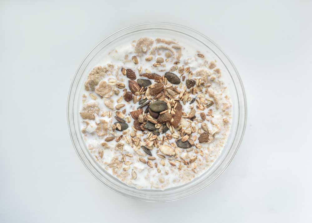 • Put the toasted chopped hazelnuts to one side. Add all the other dry ingredients to a breakfast bowl, add the milk, honey and vanilla and stir. Cover and place in the fridge overnight.
