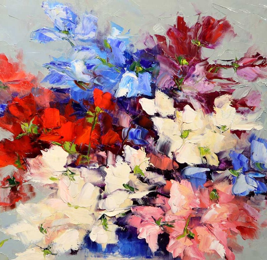 Bridget Flinn’s floral paintings are distinctive for their semi-abstracted, close-cropped representation. Each piece, while appearing spontaneous, is worked with a harmonious balance of both colour and composition. Her background and experience in natural history illustration is evident in the keen observation of details. Small and medium sized in scale, Flinn’s works are lively, expressive and joyful; www.solomonfineart.com.