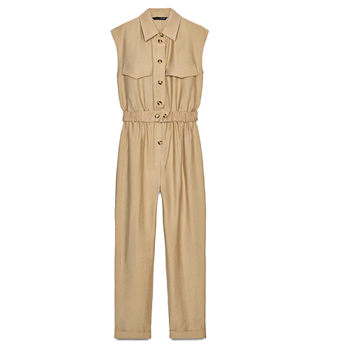 Camel sleeveless jumpsuit with belt, €49.95, at Zara
