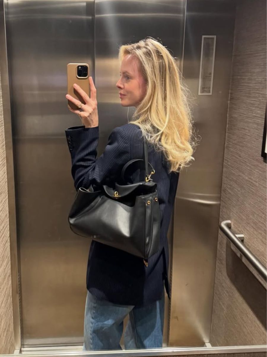 Channel Carolyn Bessette-Kennedy – the French way – with a knee-length skirt and a structured but sleek handbag.