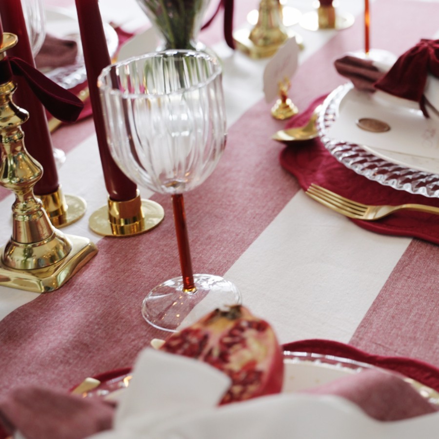 Burgundy and white cotton tablecloth, €195; www.thedesignedtable.com.