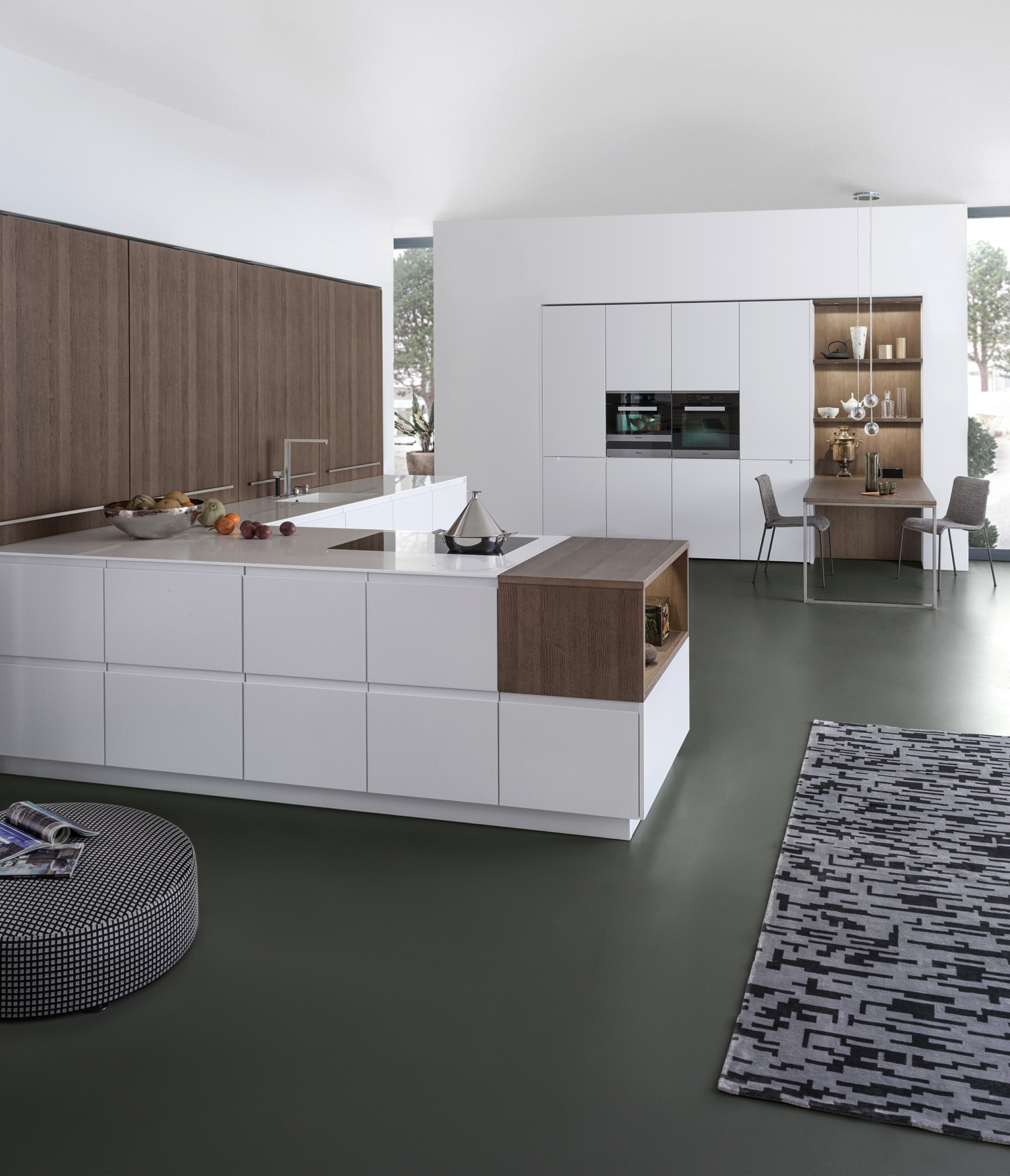 Slotted into the shelving, this nook boasts the efficiency and elegance found in this modern McNally kitchen. The Maeira Ash veneer has been stained to a darker shade which is perfect for warming up the white kitchen. www.mcnallyliving.ie