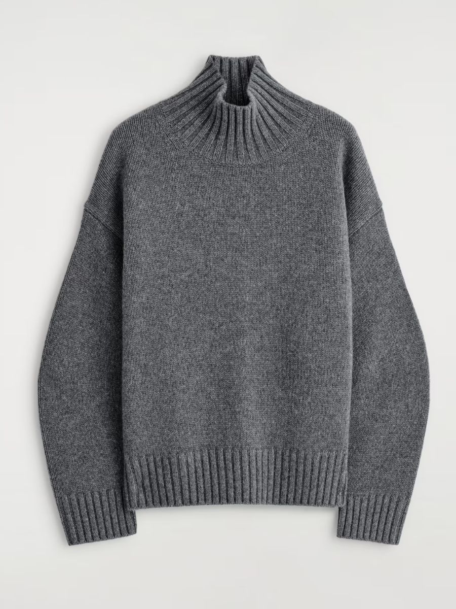 Dark grey mélange cashmere funnel-neck sweater, €279, at COS.