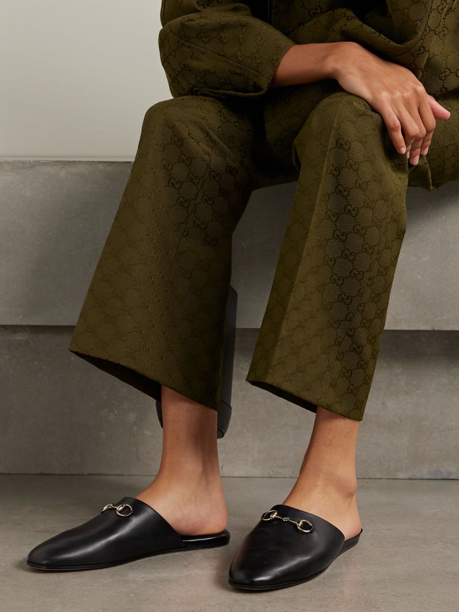 Black horsebit-detail leather slippers, Gucci, €800; www.net-a-porter.com.