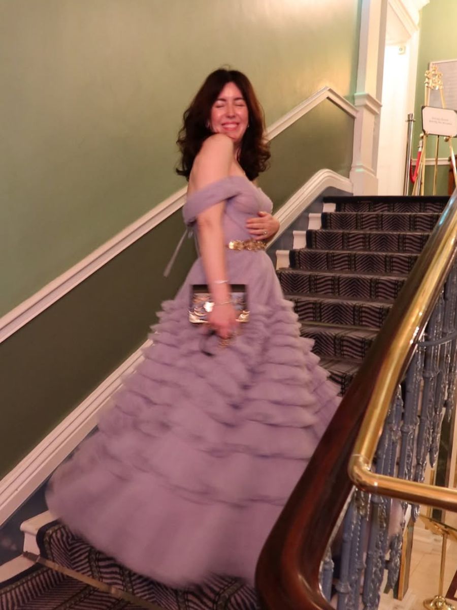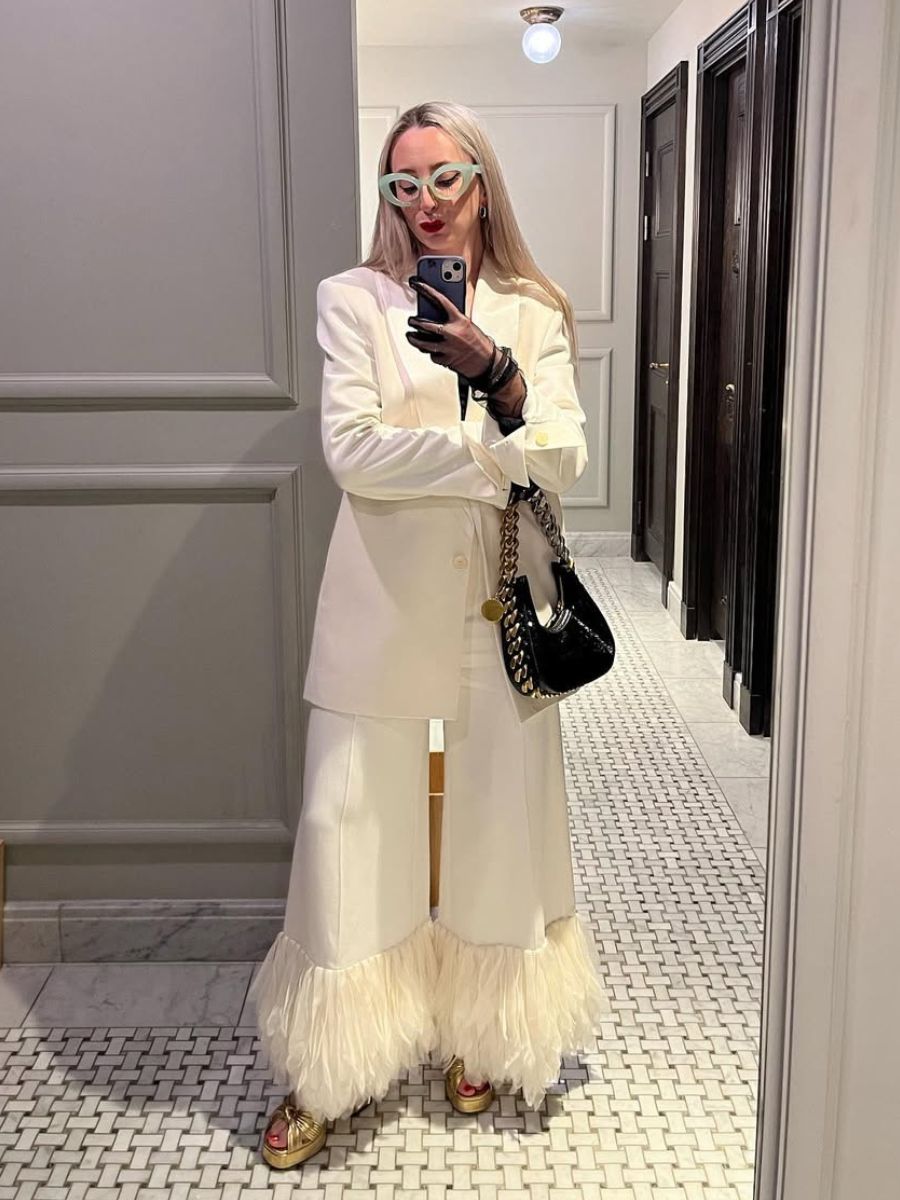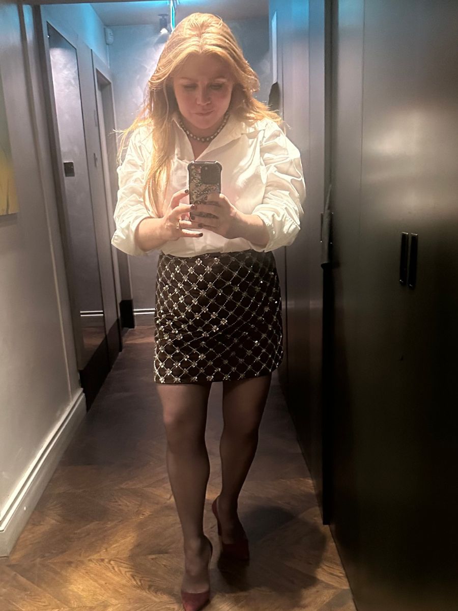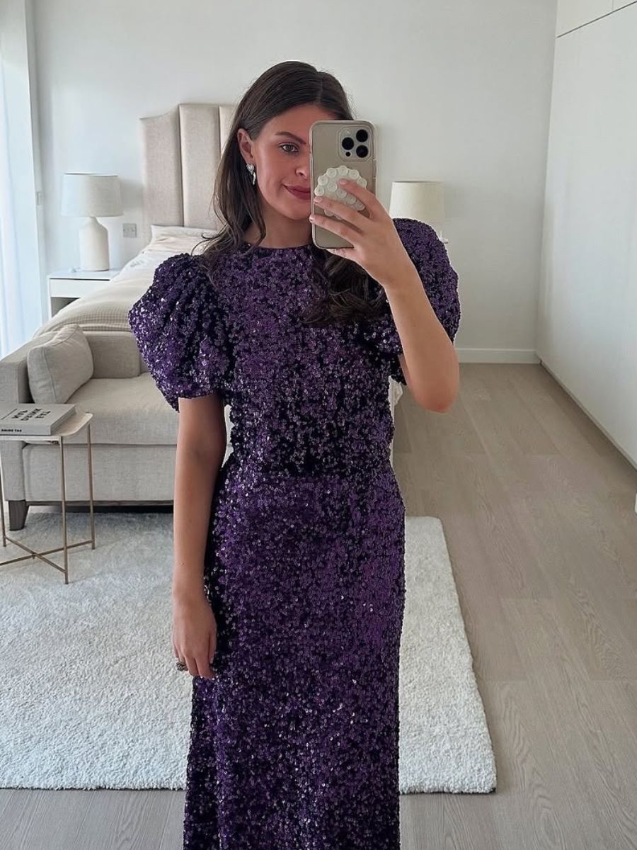 “I don’t usually shop much on the internet, but I couldn’t stop thinking about this silver sequin dress. When it arrived, it was even more beautiful in real life: it’s the kind of piece that genuinely makes your heart skip when you slip it on. I’ve styled it here with bold blue earrings from Melissa Curry that add a playful pop of colour and my trusty silver slingbacks. It’s a look that’s elegant, a little bit sparkly and comfortable enough to dance the night away in.” @jesscolivet