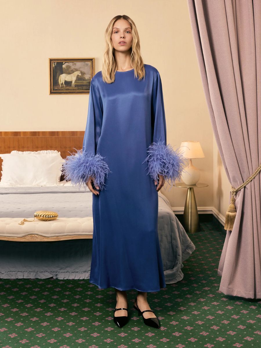 Navy Suzi feather-detail maxi dress, €475; eu.the-sleeper.com.