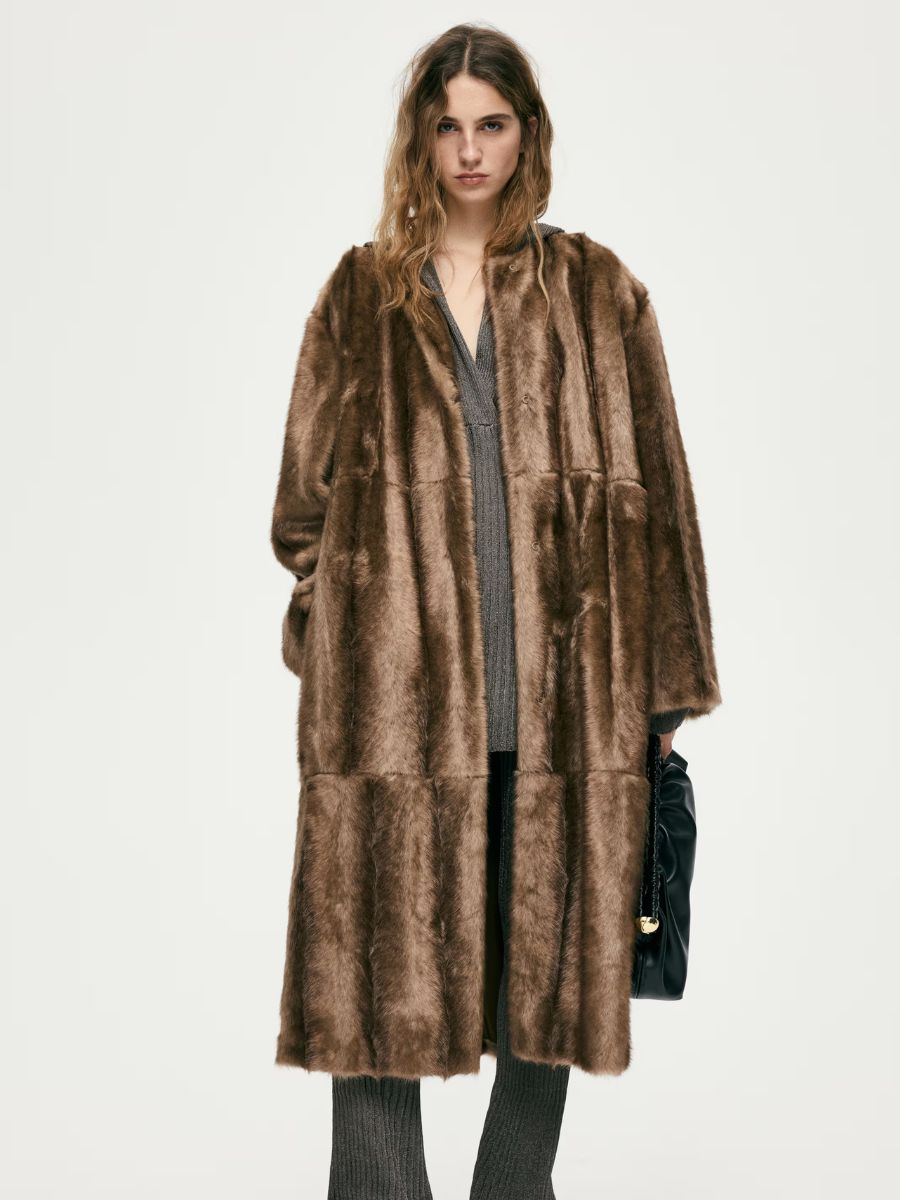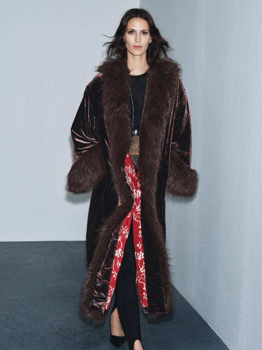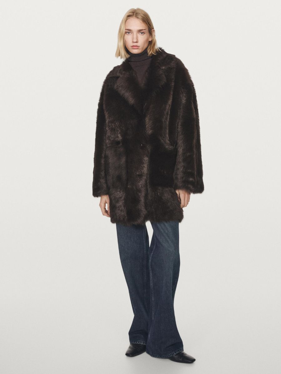 Brown long leather coat with fur, €1,700, at Massimo Dutti.
