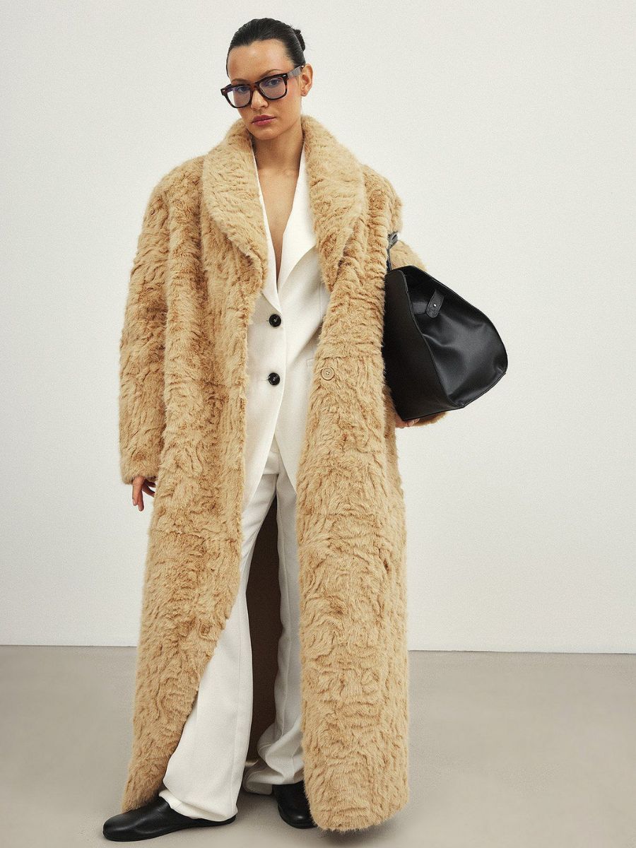 Beige oversized long faux fur coat, €132.96; www.na-kd.com.