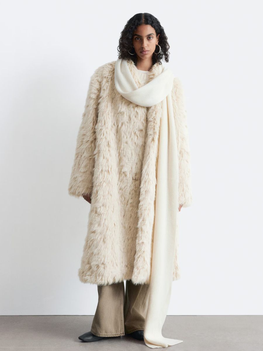 Dusty white faux fur midi-length coat, €199, at & Other Stories.