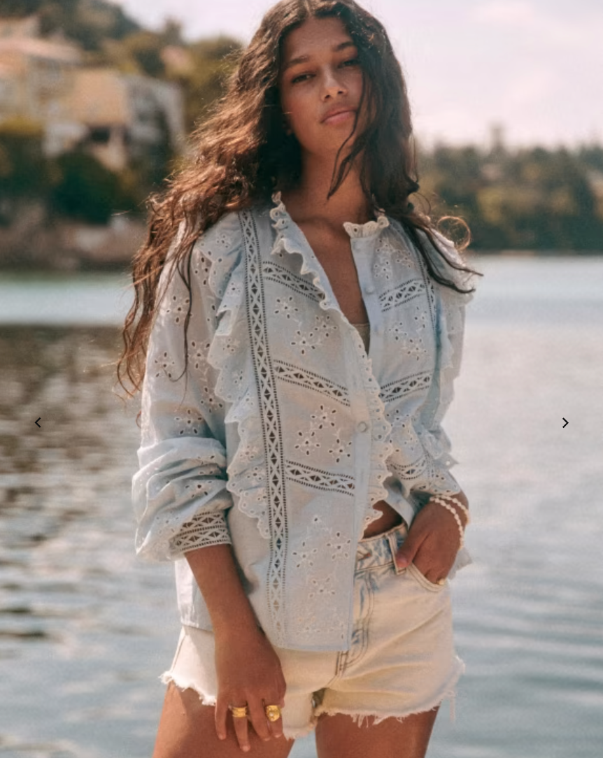 Light blue Irma embroidered shirt, €95; www.sezane.com.
