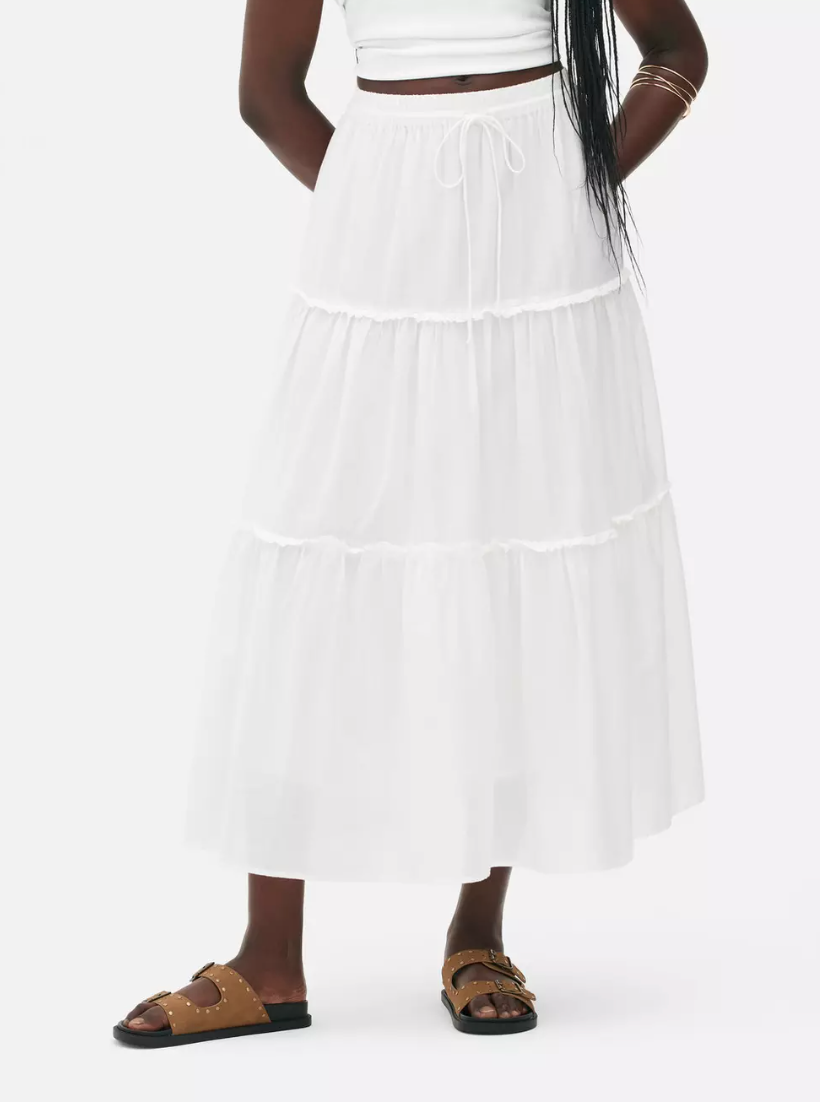 White tiered mixi skirt, €18, at Penneys.