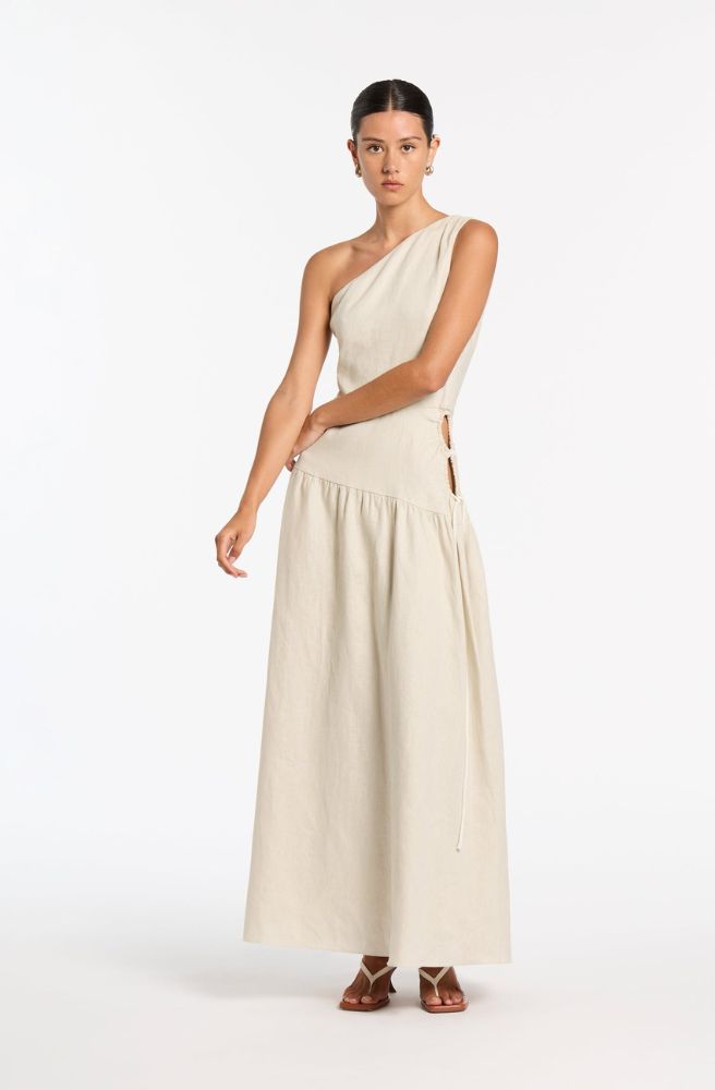 One shoulder relaxed fit maxi-dress, €436.95; us.sirthelabel.com.