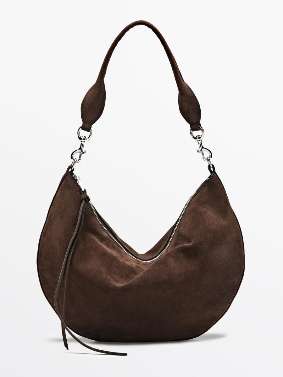Brown split-leather half-moon bag, €190, at Massimo Dutti.
