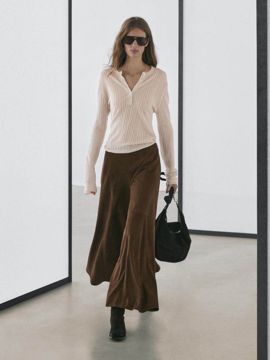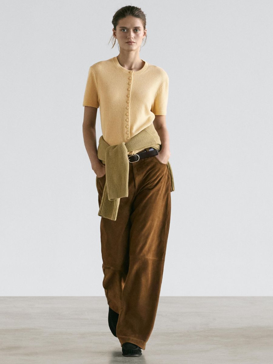 Brown suede flared trousers, €400, at Massimo Dutti.