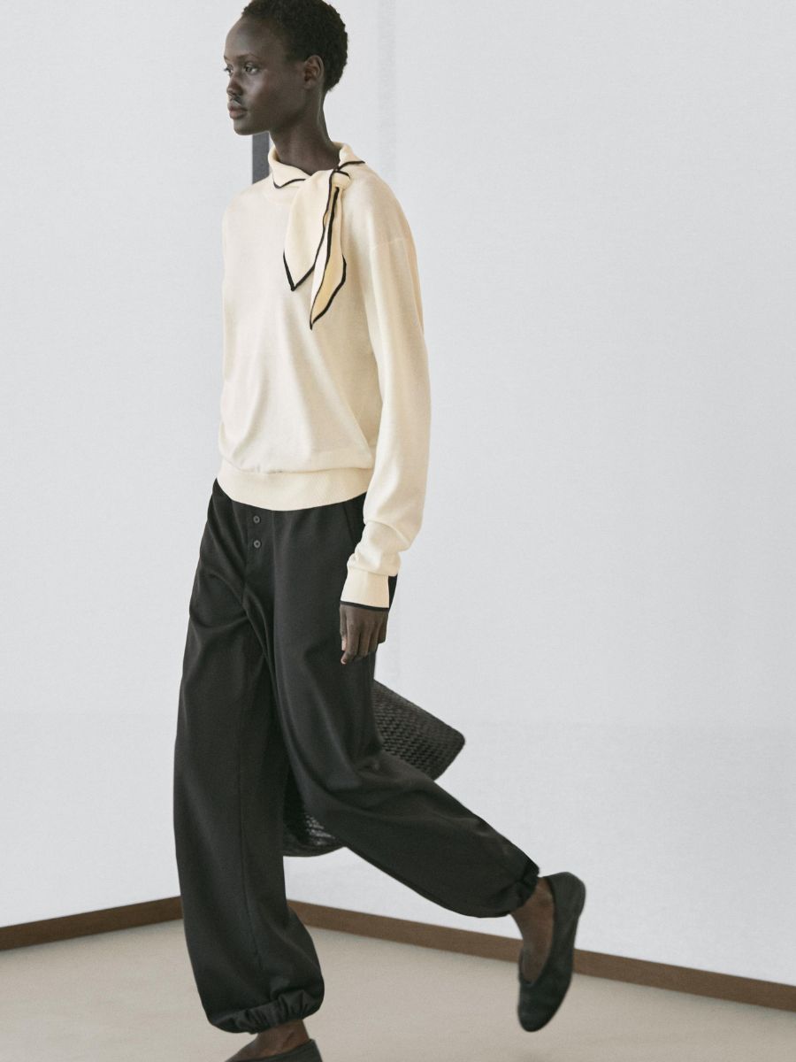 Cream scarf-detail cotton sweater, €80, at Massimo Dutti.