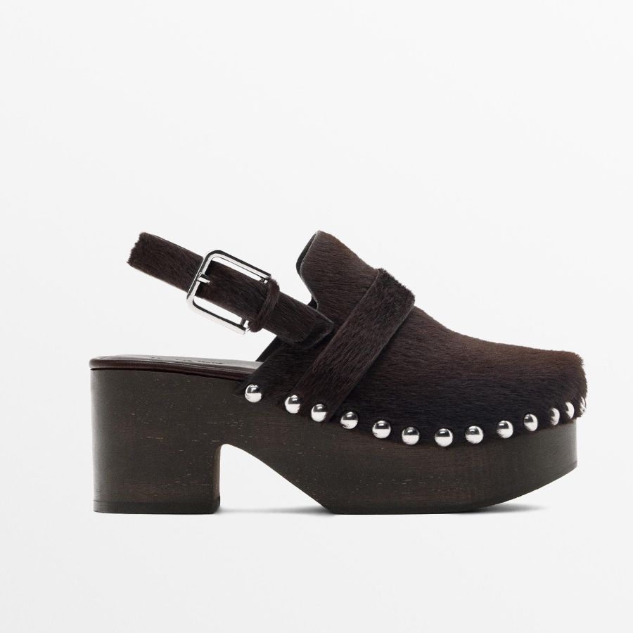 Brown leather clogs with wooden soles, €160, at Massimo Dutti.