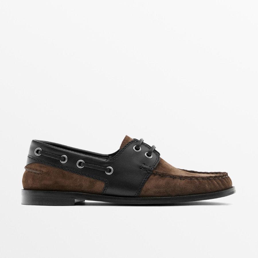 Brown contrast-leather deck shoes, €130, at Massimo Dutti.