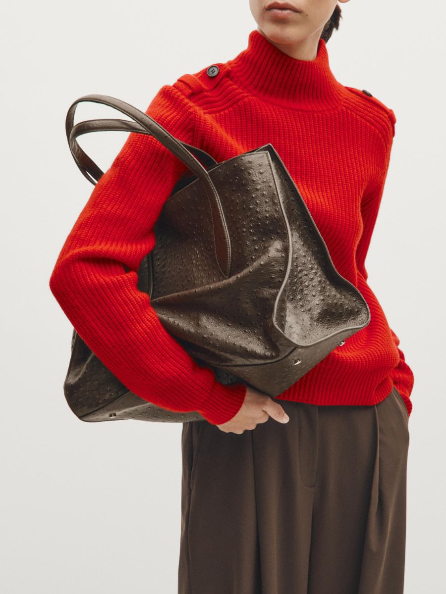 Brown textured leather bag, €500, at Massimo Dutti.