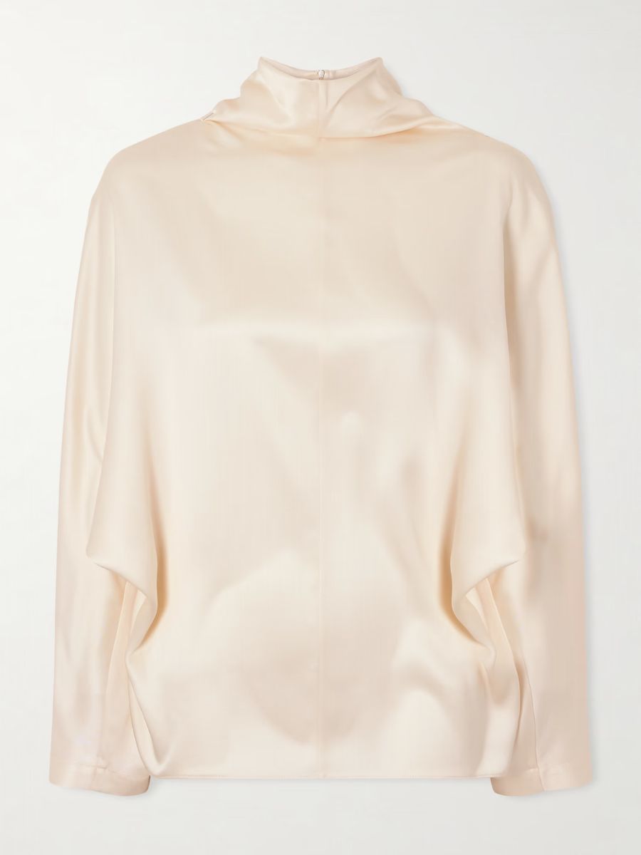 Cream silk-satin high-neck blouse, Brunello Cucinelli, €1,700; www.net-a-porter.com.
