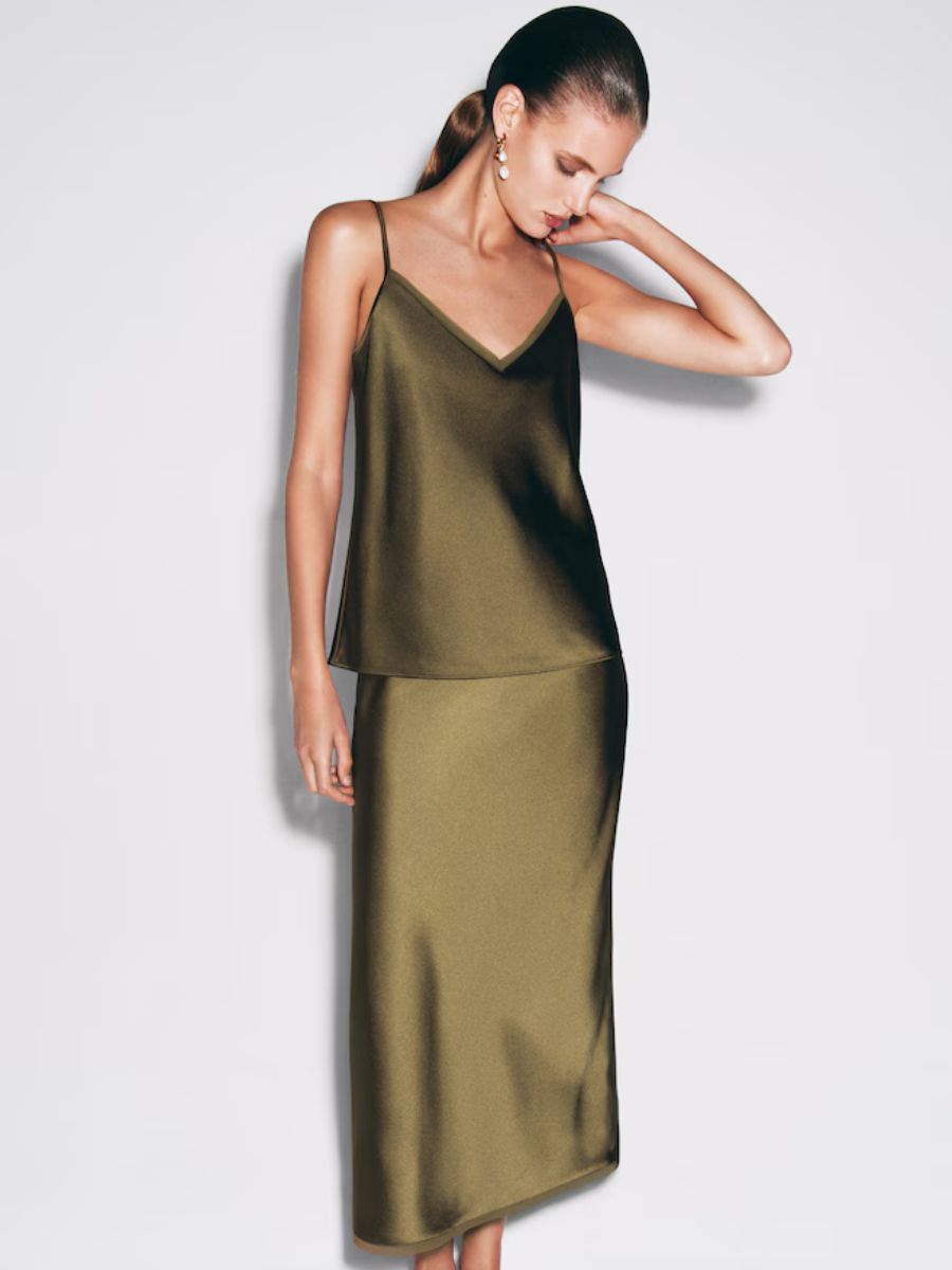 Khaki bias-cut satin midi skirt, €99, at COS.