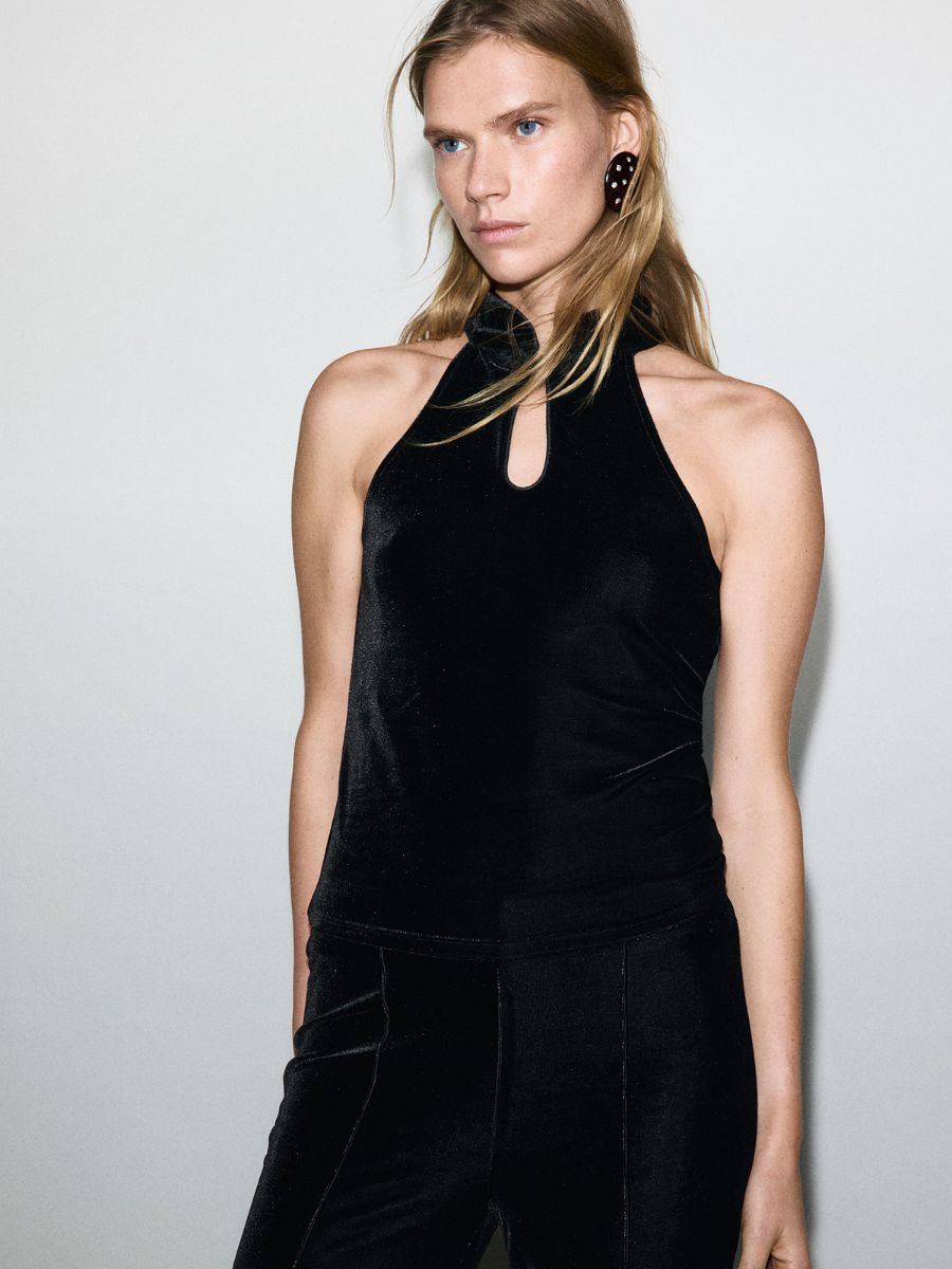 Black velvet top with toggle buttons, €22.99, at Mango.