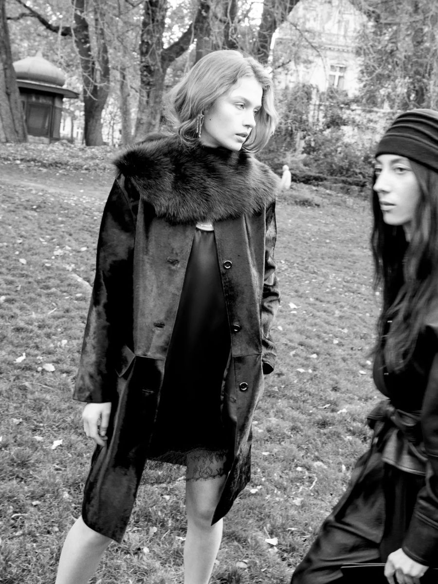 Black long lambskin coat, €1,700, at Massimo Dutti.
