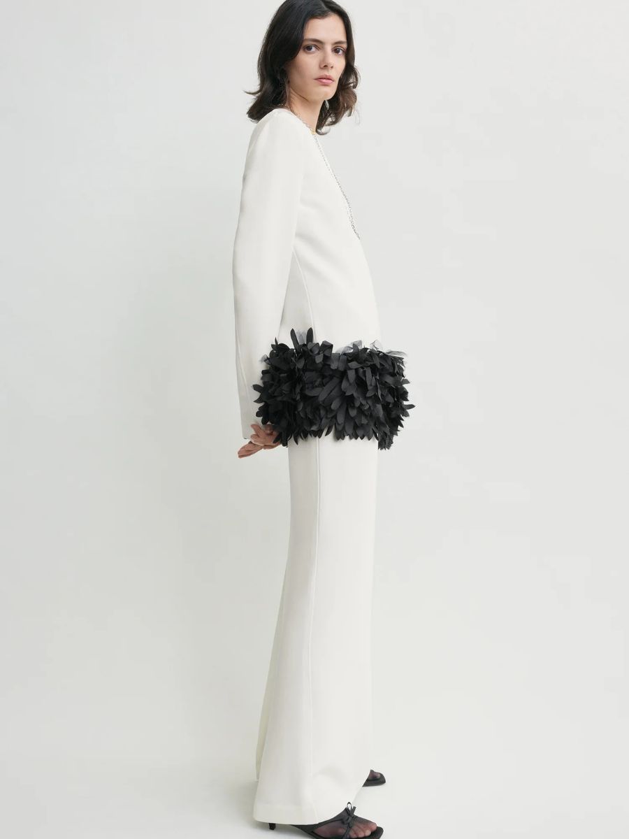 Off-white feather-detail maxi dress, €1,460; www.toteme.com.