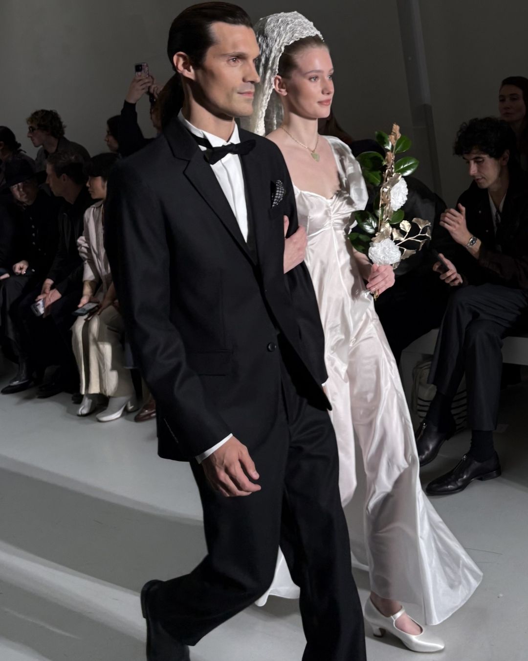 13:00 Gabriela Hearst courted us with food. As we mounted the steps into Petit Palais, an early 20th–century museum with opulent ceiling frescoes, one of the first sights on arrival was a bacchanalian spread by none other than renowned chef Alain Ducasse. But it was the clothes that we stayed for. The show opened with an ivory cashmere floral lace dress with handkerchief sleeves and godets with hand–painted cowboy boots, and closed with a black sheer silk organza and ivory fine bobbinet hand-placed floral embroidered slip dress. There were some dashing military pants cut from Japanese recycled denim and cross-dyed wools with handwoven herringbone tweed coats. Backstage, Hearst shared that the show was homage to Eglantyne Jebb, a humanitarian who advocated for children’s rights, leading to the foundation of Save the Children (which Hearst regularly works with). Everything felt purposeful, with strokes of romanticism.