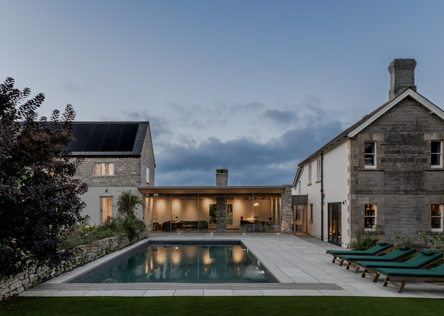 As for the design, it’s quiet and precise, emphasising texture, proportion and natural light over architectural bravado. Clad in locally quarried blue lias stone and topped with a gently pitched roof, the link building is a study in restraint. Five glazed panels run its full width, sliding open to connect both the farmhouse and barn to a south-facing terrace and swimming pool.
