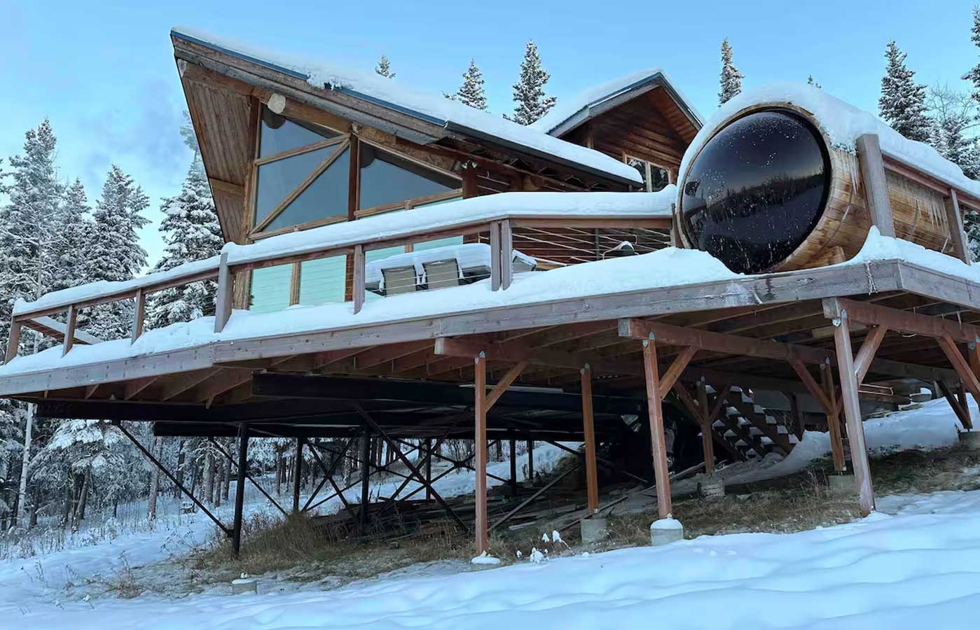 A Belatopia property nestled on three acres of land 20 minutes from Fairbanks where the Northern Lights are visible nearly every clear night from September to April. During summer, watch the midnight sun set on the large deck complete with outdoor dining area or in the private barrel sauna with panoramic views, while inside you can expect a gourmet kitchen, wood-burning stove, Blaze King fireplace and three ensuite bedrooms. Sold!