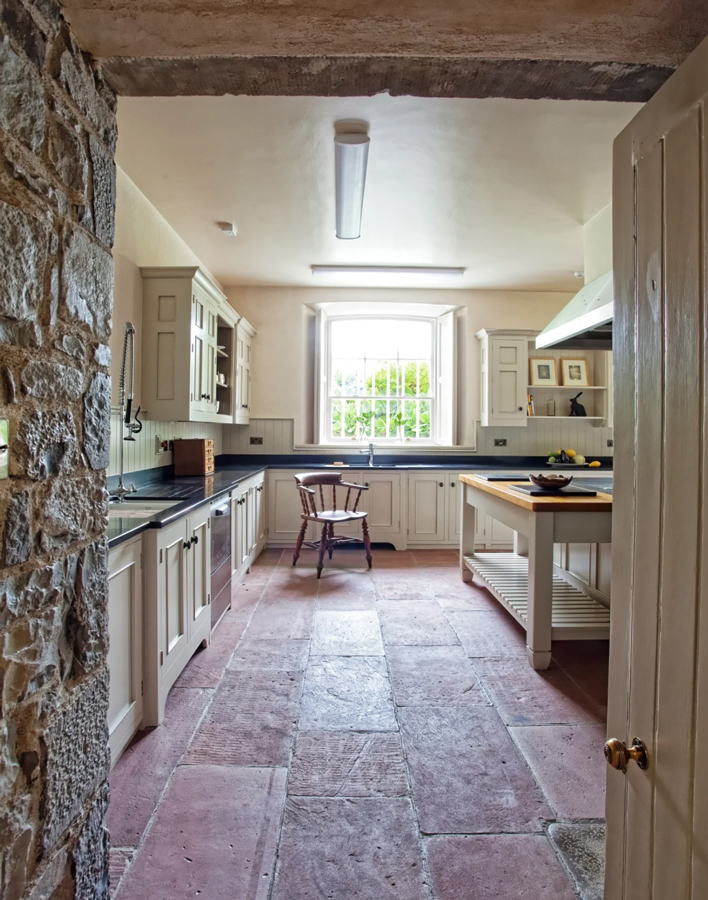 This country-style kitchen features exquisite stonework, free-standing island, well-crafted wainscoting, classic fittings, butt-hinges, panel doors and a hand-painted finish to create a feeling of grandeur. While it lacks maximalism, the details in stately homes like this are all in the craftsmanship. @oconnorsofdrumleck