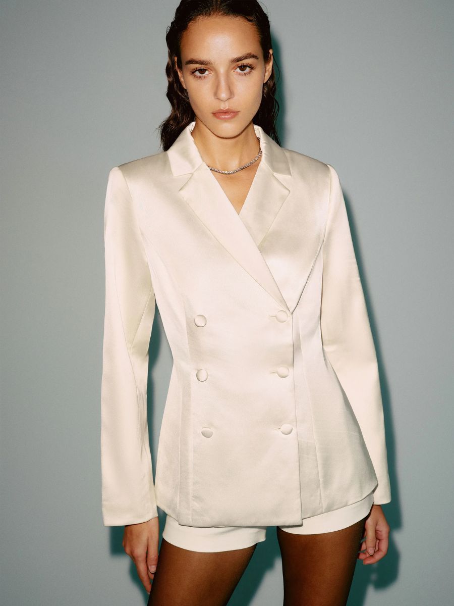 This season, brands have upped the ante when it comes to luxury, with a cream blazer becoming a prestige buy, akin to a fashion flex by those in the know. Toteme’s satin blazer comes in at a cool €990, while brands like Khaite cost into the thousands. However, buy the right style and you will have it forever. Also, keep an eye on The Outnet for generous discounts on stealth wealth labels. (This writer nabbed a pure Italian wool double-breasted tuxedo blazer from J Crew in a Black Friday flurry; a smart investment that will pay dividends.) On the high street, pay attention to composition – aim for wool or wool-blend fabrics if your budget allows. At the affordable end of the scale, H&M’s two-tone blazer, below, has impact, while mid-range label Reformation currently has a satin blazer with a high-collared neckline and an elegant, cinched waist.