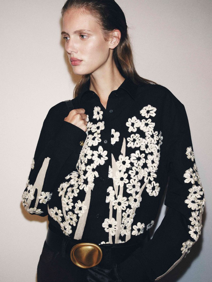 Blue appliqué textured shirt, Khaite, €2,800, at Brown Thomas.