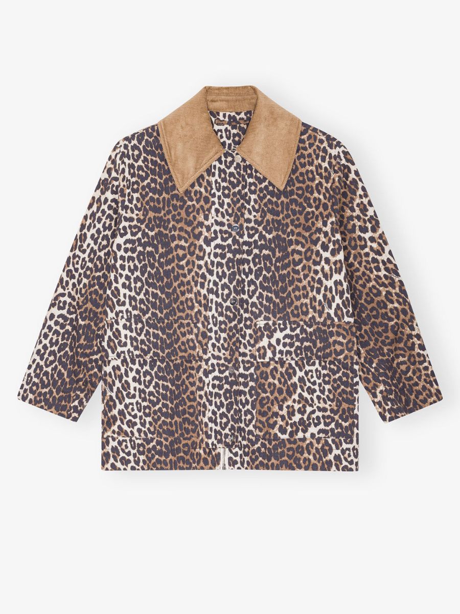 Leopard print canvas midi-length jacket, €395; www.ganni.com.