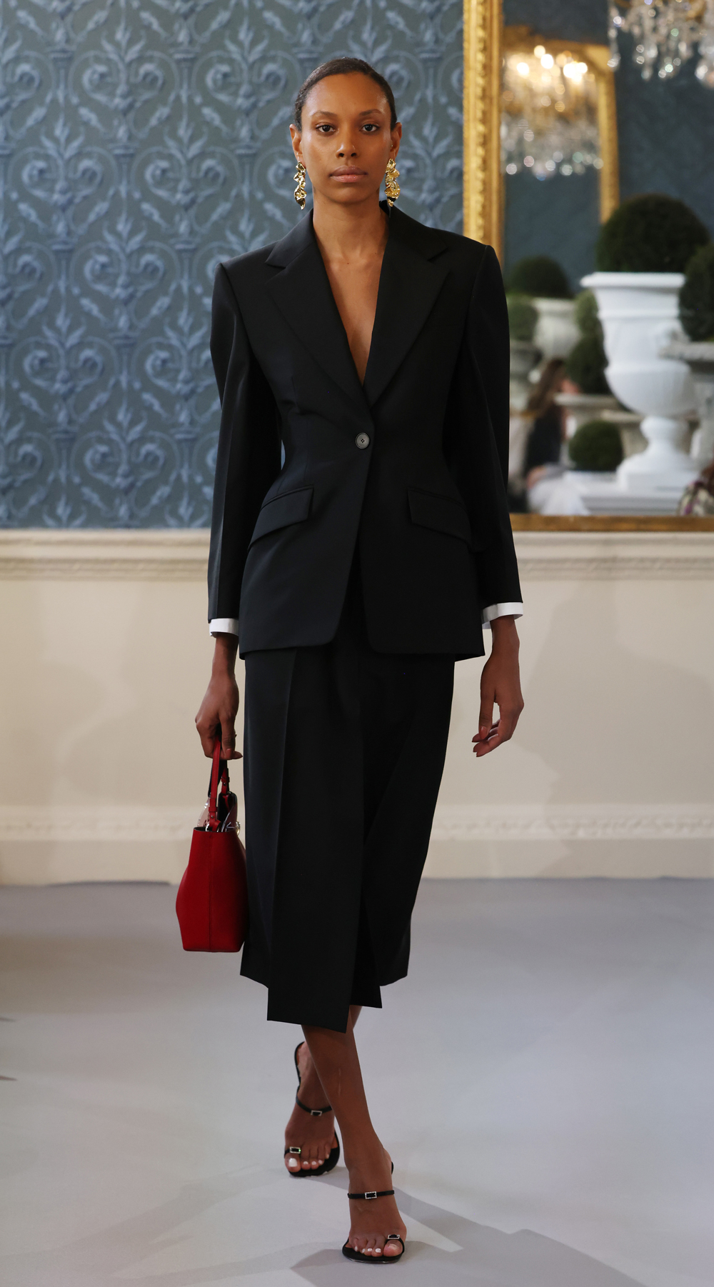 Florals for spring were presented in new guises; Stella McCartney’s double-breasted Boyfriend suit with floral embroidery offers a modern take on occasionwear tailoring; Khaite’s black shirt with floral appliqué was paired with loose leather trousers; while Alexander McQueen’s gauzy asymmetric one sleeve dress, designed by Irishman Seán McGirr, had a soft meadow floral print.