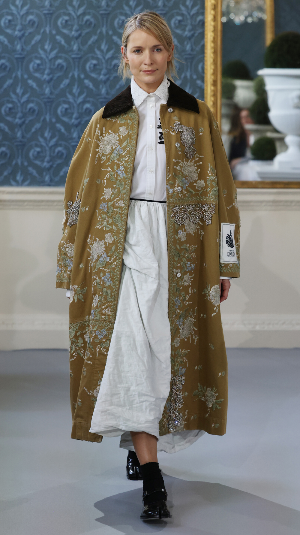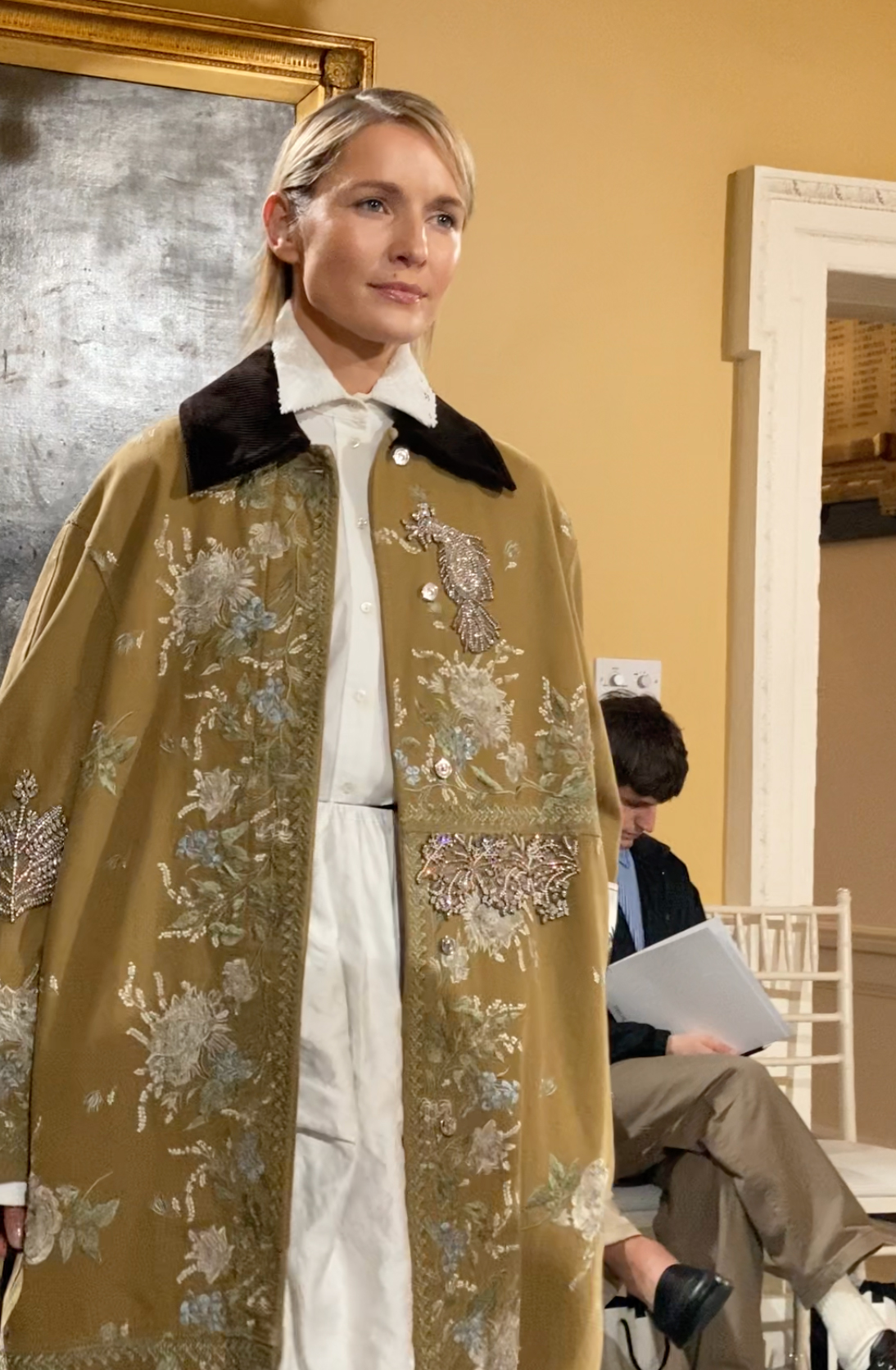 Standout looks include Dries Van Noten’s sequinned blazer (the brand opened the show with seven looks, including a bright yellow brocade evening coat and a green sequinned jacket, all paired with its trending 1970s-style trainers for a high-low approach) and Erdem’s exquisite embroidered and embellished coat, which closed the show.