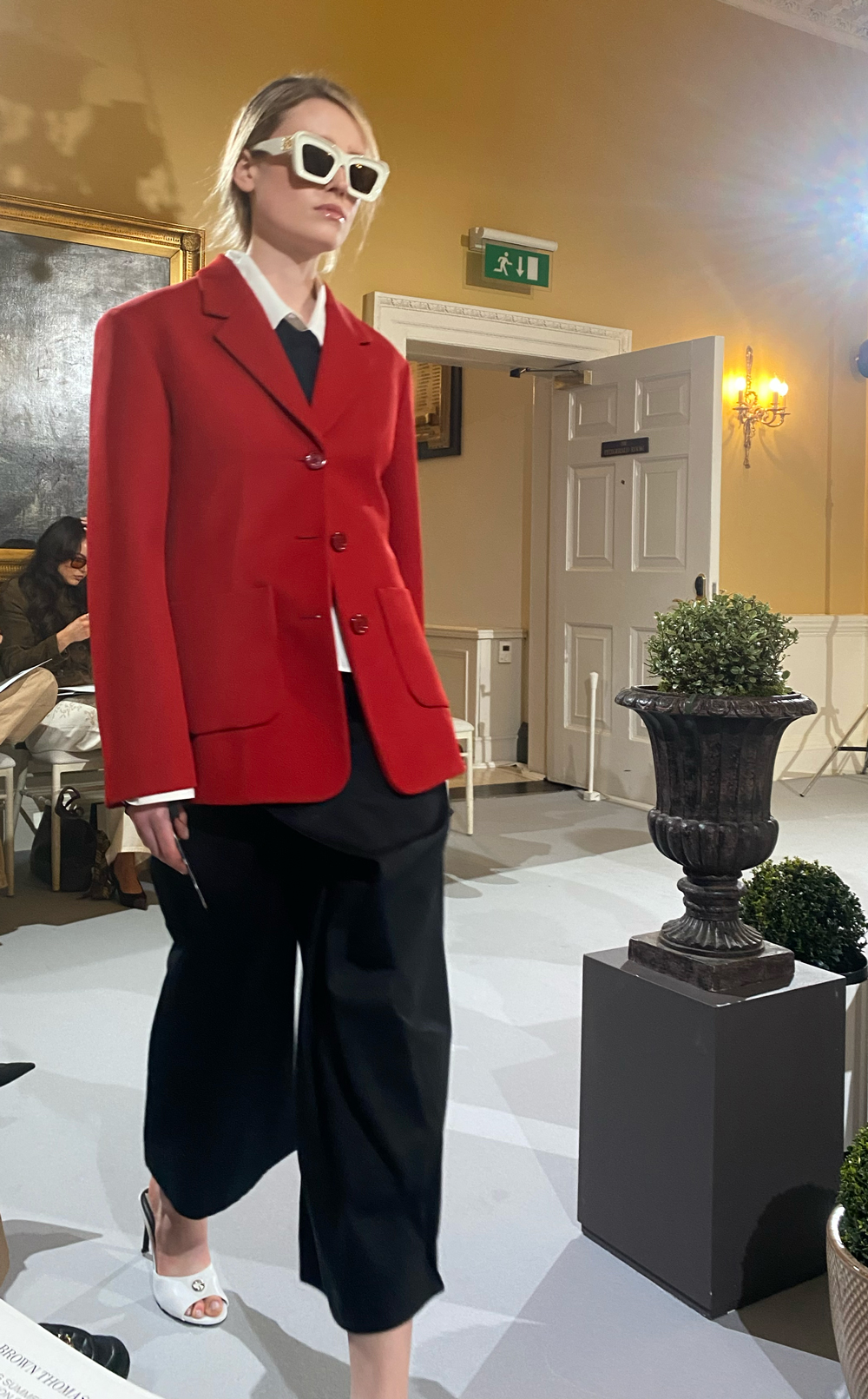 For spring outerwear (because we are in Ireland, after all) there was Sacai’s asymmetric bomber jacket with exaggerated zips, Loewe’s bright red single-breasted blazer, and Alexander McQueen’s puff-shoulder trench coat worn tightly belted at the waist.