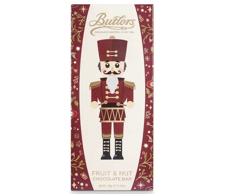 Christmas Nutcracker Fruit & Nut Bar: A creamy milk chocolate bar with a mouth-watering blend of succulent raisins, crunchy almonds and hazelnuts all wrapped up in a colourful Nutcracker box. Almost too good to eat!