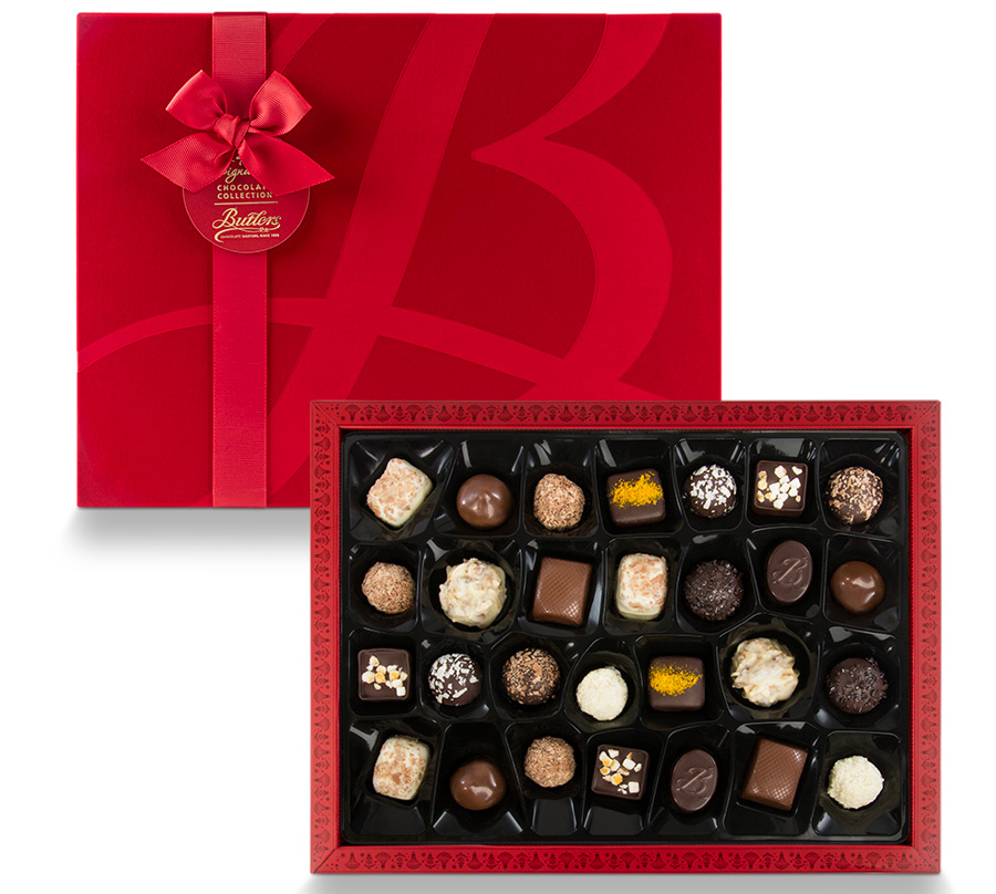 Red Velvet Presentation Box: The ultimate Christmas luxury. An exquisitely presented red velvet presentation box containing 14 or 28 – you know you want the larger box! – of Butlers most popular and treasured chocolates.