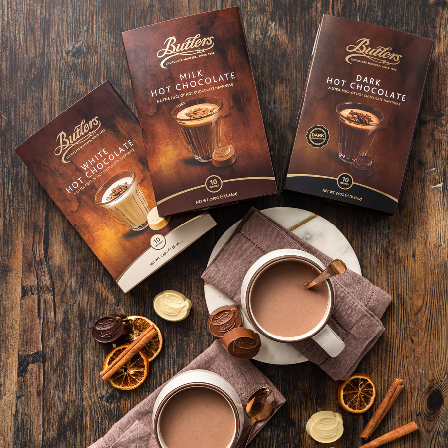Butlers 90g Chocolate Bar range: Available in ten varieties to suit every mood, from velvety Milk Salted Caramel to bold 78% Dark Chocolate. Explore the colourful range here.