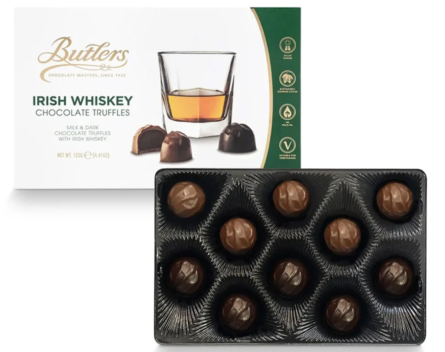 Butlers Irish Whiskey Truffles: Guaranteed to please the most ardent of whiskey lovers, this sublime choice of rich chocolate truffles, delicately enhanced with Irish whiskey and captured in glorious milk and dark chocolate shells, will go down a treat with the adults.