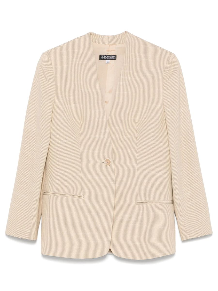Beige striped collarless blazer, Giorgio Armani, €280; www.farfetch.com.