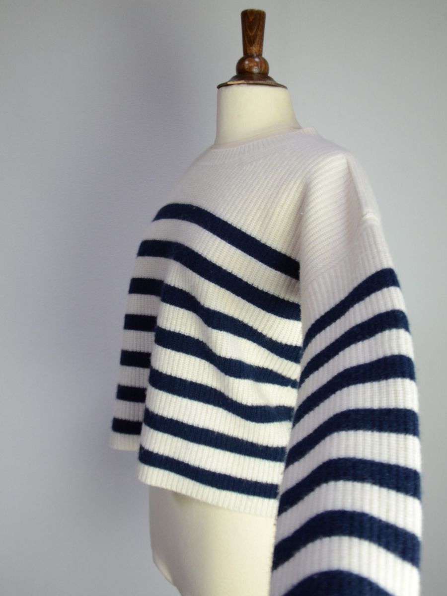 White striped cashmere top, La Ligne, €120, at Cobbler’s Wardrobe.