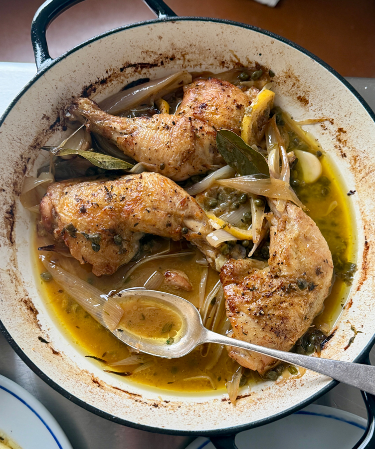 5. Put into the oven and immediately turn the temperature down to 150°C. Cook for about 1 hour, or until the chicken is falling off the bone and the shallots are soft and silky underneath. If the pan looks a little dry at any point, add another splash of cider.