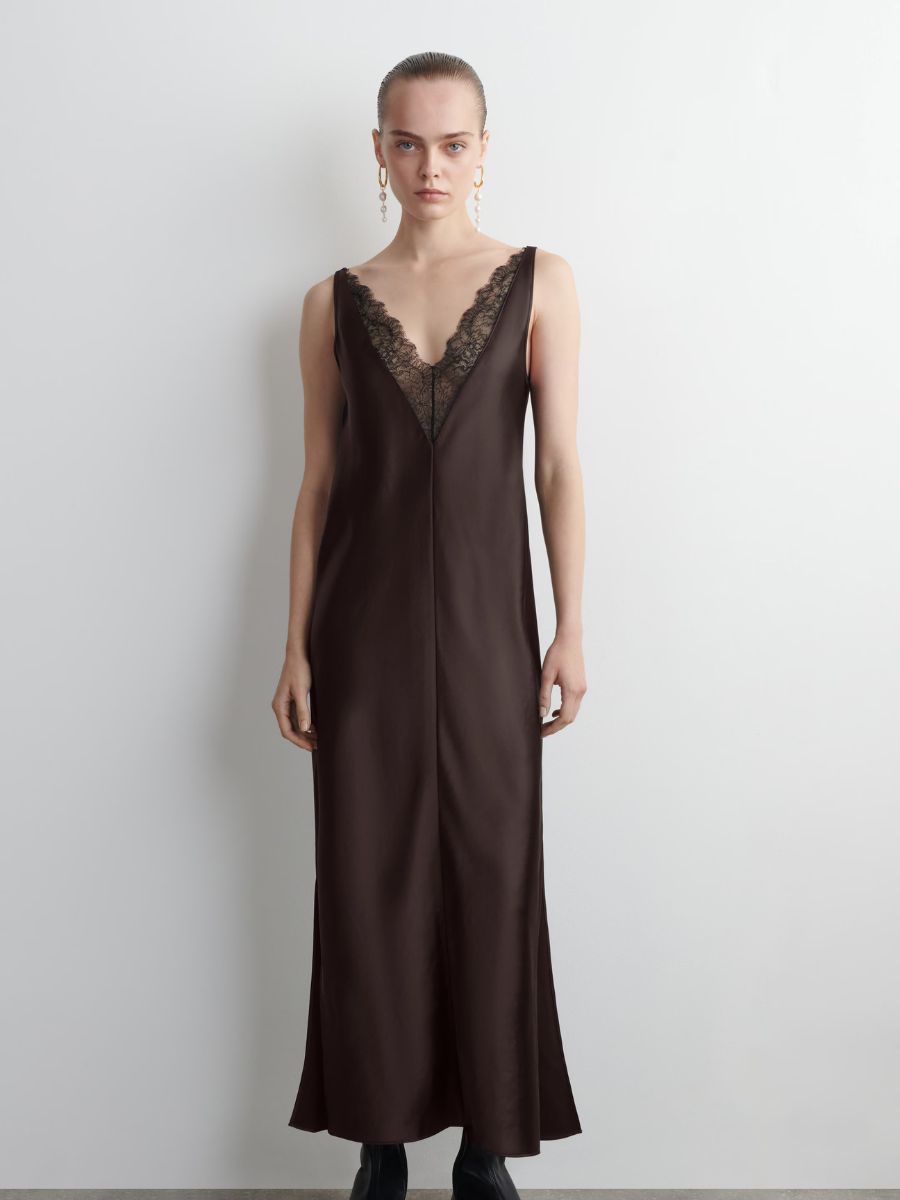 Chocolate brown lace-trim silk-satin dress, €129, at COS.